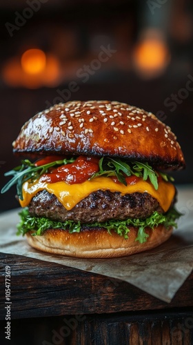 Gourmet cheeseburger with sesame seed bun, culinary delight. Tasty fast food concept