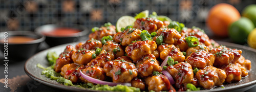 Gourmet chicken fajitas beautifully arranged with dipping sauces, culinary delight