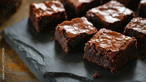 Gourmet chocolate brownies arranged on a textured backdrop of slate and wood for a delightful dessert presentation