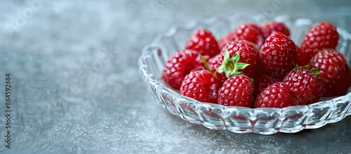 Gourmet dessert of red ripe raspberries displayed on a glass mini plate with copy space image.