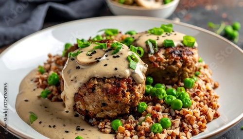 meatball, sauce, buckwheat, pea, food, dish, plate, epicure, creamy, topping, delicious, meal, dinner, healthy, protein, grain, side, cooked, served, closeup, appetising, rustic, texture, brown, beige, white, green, dark