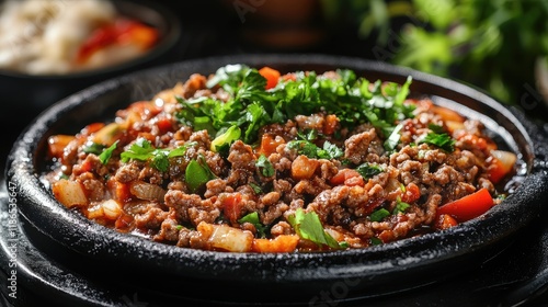 Gourmet Minced Beef Dish with Fresh Vegetables on Hot Stone for Culinary Inspiration