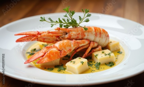 Gourmet seafood dish with lobster.
