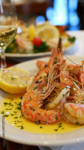 Gourmet shrimp dinner with fresh herbs and lemon on elegant table
