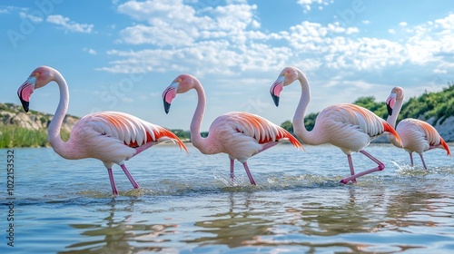 flamingo, bird, water, nature, wildlife, pink, aquatic, graceful, animal, environment, feather, stream, tropical, scene, serene, habitat, flock, colourful, sunny, sky, landscape, calmness, migration, elegance, group, shore, moment, plumage, peaceful, marsh, vibrant, wetland, beauty, soft light, exploration, animal, exotic, swimming, coastline, scenic, play, shore bird