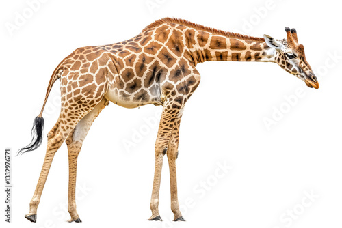 Graceful giraffe with patterned coat stretches neck down, cut out transparent