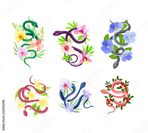 Graceful Snakes Coiled Around Beautiful Blooming Flowers Vector Set