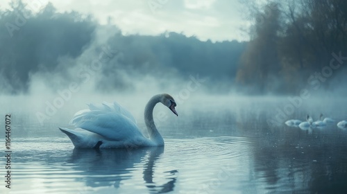 Graceful white swan gliding on a serene misty lake at dawn with gentle ripples reflecting the tranquil atmosphere of nature.