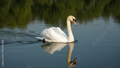 Graceful white swan on calm lake with mirrored reflection and green trees