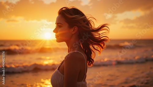 silhouette, woman, sunset, beach, serenity, beauty, grace, warmth, wave, nature, ocean, sunlight, profile, emotion, adult, female, wind, hair, gentle, peaceful, evening, colours, tranquil, moment, stillness, horizon, shoreline, summer, calm, 1, solitary, mystery, essence, dusk, allure, picturesque, ambience, elegance, relaxing, simplicity, graceful, natural beauty, coastline