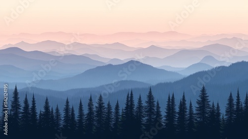 Gradient mountain landscape at night with foggy valley, ideal for nature art, scenic illustrations, travel design, environmental awareness, and digital graphic projects.