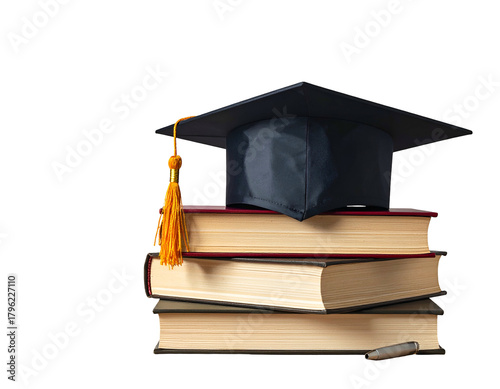 Graduation cap atop stack of books, pen on bottom