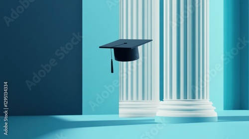 graduation, cap, academic, ceremony, degree, diploma, education, learning, student, achievement, success, future, cognition, skill, university, college, school, mortarboard, tassel, celebration, honour, pride, motivation, inspiration, opportunity, classroom, decor, modern, minimalist, three-dimensional, rendering, visual, design, illustration, background, light, colours, blue, white, column, classic, architecture, ancient