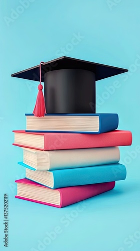 Graduation cap on books, education concept, blue background, learning