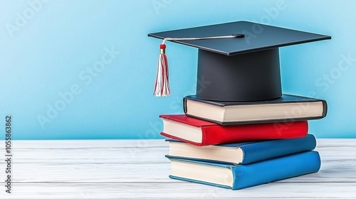 Graduation Cap on Colorful Books Against Blue Background