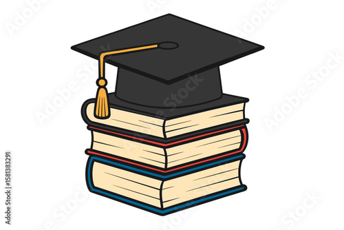 "Graduation Cap on Stack of Textbooks. Mortarboard on Piles of Books. Higher Education Concept. Symbolizing Study, School, University, College Learning and Academic Success."
