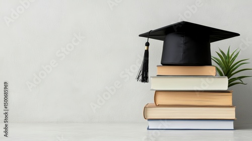 Graduation cap placed on a stack of books with a small plant next to it, representing academic success and knowledge
