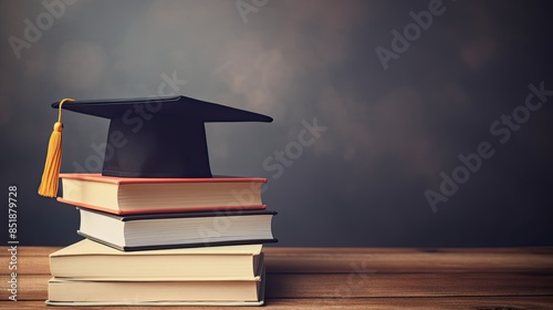 Graduation hat and stack of study books. with copy space