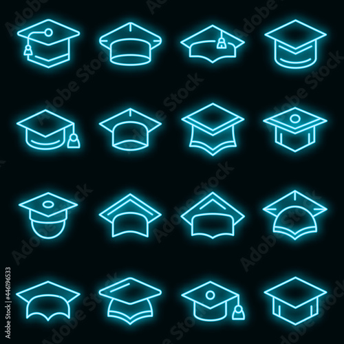 Graduation hat icons set. Outline set of graduation hat vector icons neon color on black
