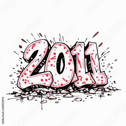 Graffiti art year 2011 with pink and red accents and debris on white background number text