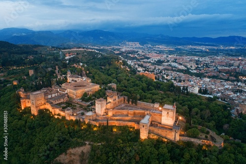granada, aerial, alhambra, spain, city, town, architecture, andalusia, landmark, travel, old, ancient, europa, building, tour tourism, city landscape, drone, up high, skyline, palace, fortress, complex, roman, historical, vintage, royals, renaissance, islam, islamic, night, evening, dusk