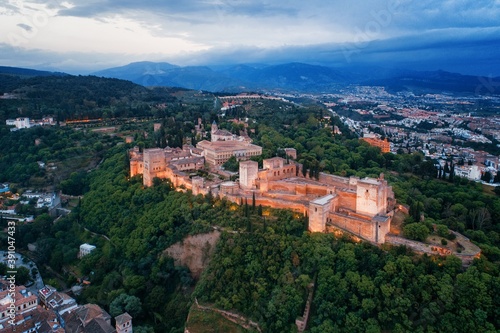granada, aerial, alhambra, spain, city, town, architecture, andalusia, landmark, travel, old, ancient, europa, building, tour tourism, city landscape, drone, up high, skyline, palace, fortress, complex, roman, historical, vintage, royals, renaissance, islam, islamic, night, evening, dusk