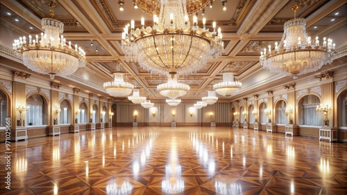 Grand ballroom with sparkling crystal chandeliers , elegant, luxurious, opulent, glamorous, rich, lavish, fancy