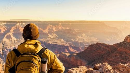 grand canyon, hiker, backpack, sunrise, scenic, vista, travel, adventure, landscape, nature, arizona, us, mountain, rock, canyon, desert, exploration, journey, outdoors, panoramic, view, golden hour, photo, tour tourism, vacation, wilderness, traveler, person, american southwest, backview
