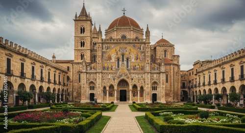 Grand cathedral with colorful mosaics and frescoes in a serene courtyard