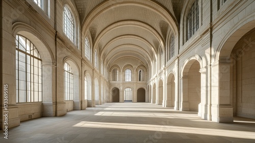 architecture, hallway, interior, design, building, room, space, grand, light, window, arch, stone, wall, floor, ceiling, column, daylight, empty, huge, roomy, open, airy, bright, elegant, classic, stylish, modern, structure, white, cream, beige, sunlight, shadow, perspective, line, pattern, texture, detail, aesthetic, calm