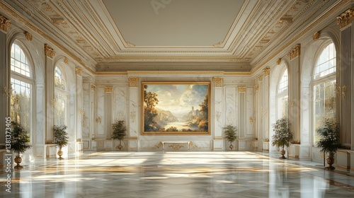 palace, hall, marble, gilded, sunlight, window, grand, interior, architecture, design, ornate, elegant, luxurious, classical, opulent, room, building, white, gold, decor, artwork, painting, landscape, art, space, light, bright, floor, ceiling, wall, plant, tree, vase, detail, column, royals, expensive, rich