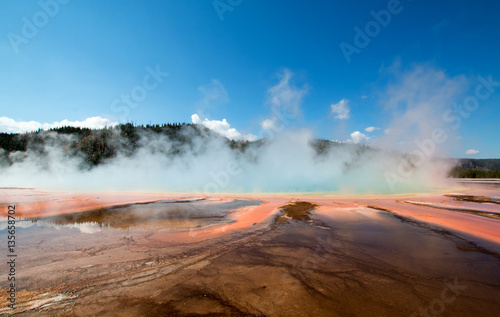 grand, prismatic, spring, midway, geyser, basin, thermal, hydrothermal, geothermal, geology, mist, steam, hot, boil, boiling, water, sauna, prism, microorganism, crater, yellowstone, yellowstone national park, national park, cloud, cloudscape, mountain, tree, orange, ocher, blue, forest, wyoming, us, us, america, north america