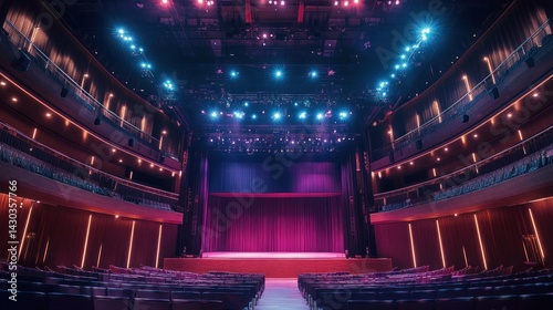 theatre, auditorium, stage, seat, light, performance, show, concert, event, venue, entertainment, music, drama, art, culture, architecture, design, interior, building, capacity, row, curtain, spotlight, dark, purple, pink, blue, night, indoor, empty, modern, grand, spectacle, illumination, glowing, elegant, lavish, opulent, brilliancy, magnificent, scenic