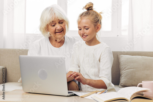 Granddaughter laptop togetherness sofa child education bonding grandmother smiling family selfie hugging