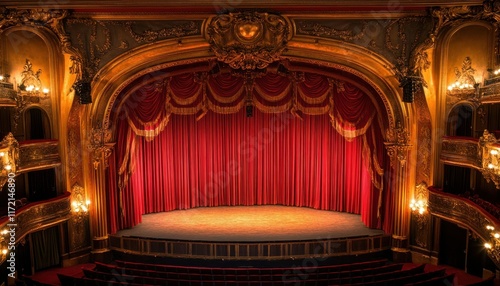 Grandeur Awaits, A Majestic Theatre Stage Ready for the Curtain to Rise in a Golden Era Setting