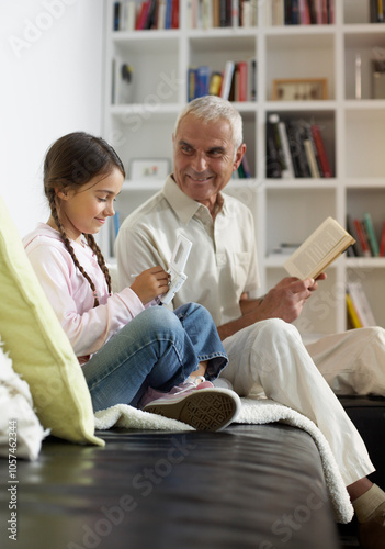 home, technology, female, girl, recreation, game, hobby, entertainment, brunette, caucasian, man, life, activity, amusement, delight, hold, children, grandchild, grandparent, grandfather, family, smile, bond, together, human relationships, room, human, children, look, youth, image, bonding, togetherness, portrait, content, to sit, casual attire, interior, childlike, reading, grin, mature, person, couch, seat, playing, living, living room, picture