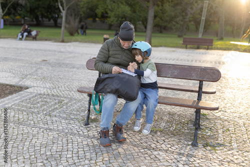 grandfather, grandson, drawing, park, bench, family, bonding, love, care, childhood, togetherness, leisure, activity, recreation, parenting, human relationships, connection, happy, moment, quality time, creative, art, education, learning, teaching, skill, development, fun, joy, lifestyle, grandparent, children