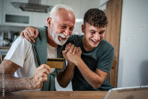 grandfather, grandson, online shopping, credit card, family, technology, cyberspace, bonding, happiness, joy, laughing, smiling, senior, boy, youth, e-business, payment, buying, sale, store, web, website, connection, human relationships, home, indoor, casual attire, spending, purchasing, success, celebrate, cheerful, lifestyle, computer, modern, device, screen, content, fun, leisure, generation gap, learning, teaching, old, new, consumerism