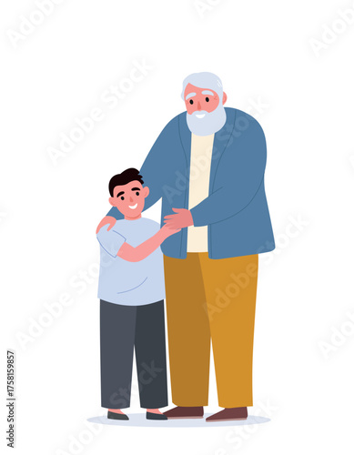 Grandfather hugs his grandson. Happy family. Vector flat graphics.