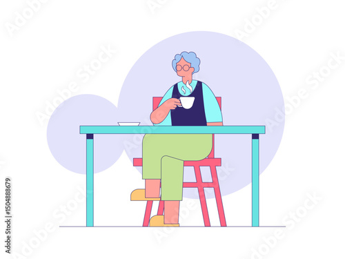 Grandma is sitting relaxing while enjoying tea. Tea illustration. Flat outline vector illustration concept.