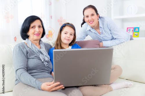 grandmother mother and daughter using laptop at home