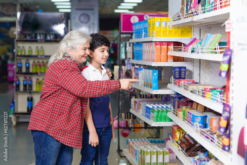 Grandmother showing some chocolate to her grandson at grocery shop.