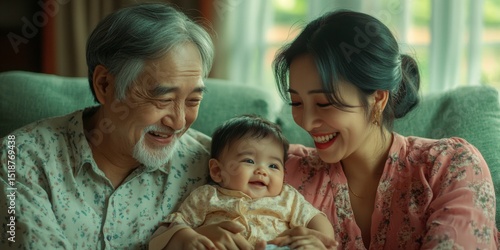 family, grandparent, mother, baby, love, together, happy, joyful, cherished, childhood, connection, affection, support, generation, human relationships, adorable, cute, sweet, peace, peacefulness, warmth, tenderness, bonding, care, smiling, home, comfort, precious, moment, tender, joy, hugs, delight, children, eltern, grandparent, asian, portrait