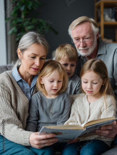 grandparent, grandchild, family, reading, book, story, togetherness, bonding, childhood, education, literacy, love, care, happy, home, cosy, sofa, living room, leisure, generation, storytelling, children, parenting
