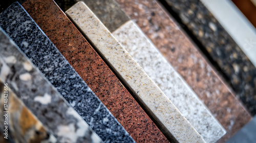 Granite and stone surface samples. A variety of styles and colors are displayed in a diagonal view. Great for design, home improvement, and construction projects.