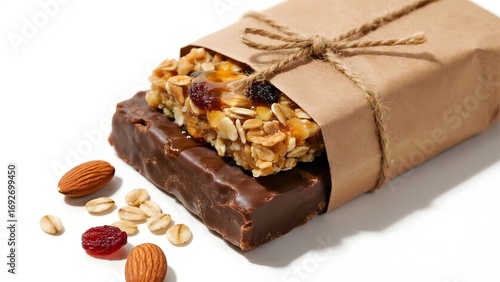Granola and Chocolate Bar Wrapped in Kraft Paper with Nuts and Dried Fruits