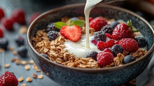 granola, berry, breakfast, yogurt, pouring, cream, healthy, food, cereal, milk, strawberry, raspberry, blueberry, blackberry, nourishment, snack, delicious, freshness, closeup, bowl, refreshment, diet, meal, morning, organic, tasty, natural, homemade, sweet, summer, fruit, vitamin, antioxidant, vibrant, balanced, cookery, culinary, dairy, ingredient