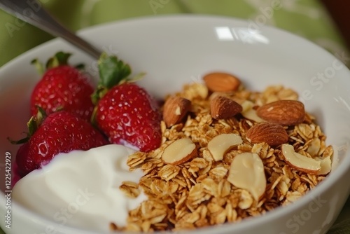 Granola with Nuts A bowl of granola mixed with roasted nuts, served with fresh berries and yogurt.