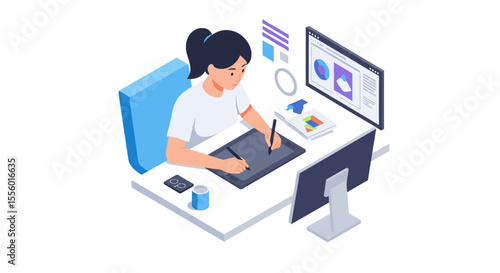 graphic, designer, digital, tool, office, desk, creativity, isometric, computer, monitor, tablet, stylus, work, professional, technology, workplace, creative, art, design, flat, concept, modern, workspace, business, person, job, innovation, illustration