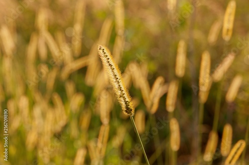 Grass at sunset in backlight close-up. Grass in the background resembles a small lights.